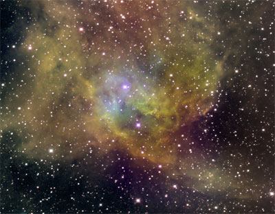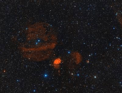 Sharpless 311 This is the emission nebula/open cluster complex NGC 2467. Already visible w/o filter. OIII > UHC. Central part around star, slightly offset to S. Further parts separated and extending to N and NE. Another extremely large part to E, forming an approximately 30' long crescent open toward NE. Narrowband image by Dean Salman.