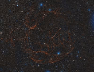 Sharpless 244 This is the Crab Nebula, the remnant of the 1054 supernova. With 7mm and UHC filter, the filaments are faintly visible, superimposed on the z-shaped synchrotron nebula, which is due to its broadband nature not responding to line filters. With a polarization filter, the polarization of the synchrotron radiation is susceptible. The shape of the synchrotron nebula changes slightly depending on filter orientation. This is most evident at the SE and NW extensions of the Z. Image by Dean Salman.