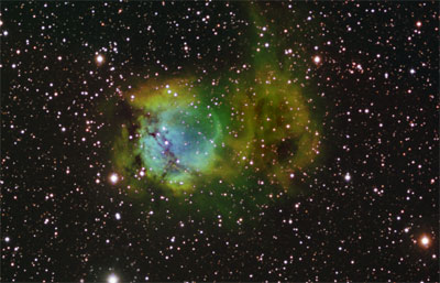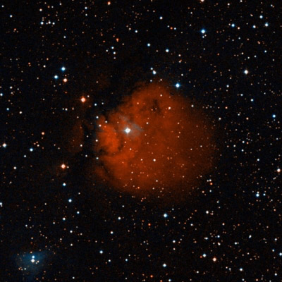 Sharpless 252 This is the Monkey Head Nebula NGC 2174/75, IC2159. Very bright nebula, visible already in my 8" without filter or in my 80mm finder with UHC as a large round glow around a bright star in the middle. Responds extremely well to OIII filter. Very structured with 22" with a well defined dark band penetrating from NW into the nebula with a superimposed chain of stars. Another more diffuse dark wedge is on the E side.