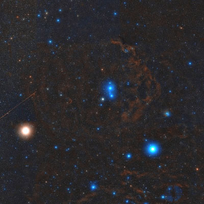 Sharpless 238 Hind's Nebula, NGC 1555, is part of the envelope around the young star T Tauri, prototype of the T Tauri class of young stellar objects (YSOs), reflecting a certain phase of high variability during the early development of stars similar to our sun. The variability of T Tauri is the reason for the variability of its surrounding nebula. While it used to be a relatively bright object around 1852, when John Hind discovered it using a 7-inch refractor, it was all but invisible only 15 years later and was not re-observed until the end of the 19th century. At present, Hind's Variable Nebula is relatively constant at a low level and hence a rather difficult object, that requires aperture and good conditions. If you know what to look for, you're already halfway there. The nebula appears as a very faint and unexpectedly large crescent bending around one side of T Tauri. Under excellent conditions, a splitting of its southern end could be observed and later verified on photographs. The neighboring "double star" may help a lot to get an idea about size of the faint crescent and its distance to T Tauri. In the same direction from T Tauri, but somewhat more distant, Otto Wilhelm Struve described in 1886 another nebula, NGC 1554, that was confirmed by d'Arrest. Whatever it was, it is no longer visible today even in the deepest photographs and possibly never was ("Struve's Lost Nebula").