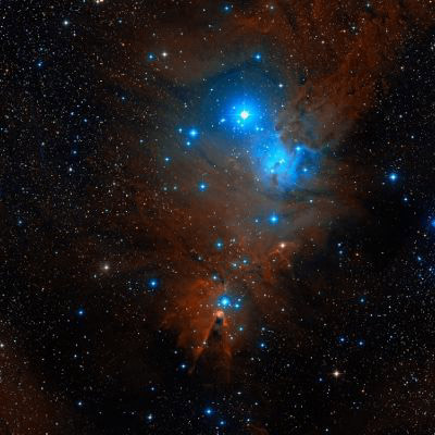 Sharpless 273 This is the region of the Fox Fur Nebula in the Christmas Tree Cluster around S Mon and the Cone Nebula. The RNe around S Mon are easily visible w/o filter. The cone nebula was observed several times with H beta filter. Not symmetrical to the tip of the Christmas tree, the E side (with further nebulosity towards E) is slightly better defined than W side. Both sides are visible, but extremely faint, forming the shilouette of the cone.