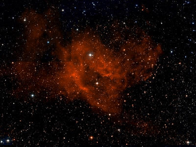 Sharpless 280 At 7mm exit pupil, a large and faint nebula is visible. Responds equally well to OIII and H-beta filters and somewhat better to UHC. Situated around pair of stars, shifted somewhat toward N from that group, appears heart shaped with two extensions towards SW. Shape relatively well defined.