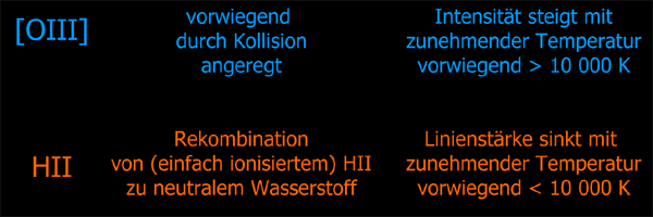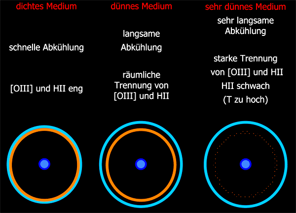 Wie kommt es nun zu den vielen unterschiedlichen beobachtbaren Strukturen der WR-Ringnebel? Gründl und Kollegen schlagen einen relativ einfachen Mechanismus vor, der vor allem darauf basiert, dass die Aussendung von HII und [OIII] auf unterschiedlichen Anregungsmechanismen beruht. Während das angeregte Niveau des der [OIII]-Strahlung zu Grunde liegenden Übergangs der Sauerstoffionen vorwiegend durch Kollision besetzt wird, beruht die Emission von HII auf der Rekombination von ionisiertem Wasserstoff (Protonen) mit freien Elektronen. Während die Emission von [OIII] somit mit steigender Temperatur zu nimmt, sinkt die Intensität in den HII-Linien mit steigender Temperatur, da die Rekombination zunehmend schwieriger wird.