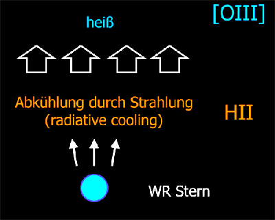 Trifft nun der schnelle WR-Wind auf den langsameren RSG-Wind, so ist die entstehende Schockfront an ihrer Vorderseite sehr heiß, so dass dort hauptsächlich [OIII] emittiert wird. Durch Strahlungskühlung verringert sich die Temperatur in den Bereichen, die näher zum zentralen WR-Stern liegen, so dass von diesen weiter innen liegenden Regionen auch HII-Emission ausgesandt wird.
