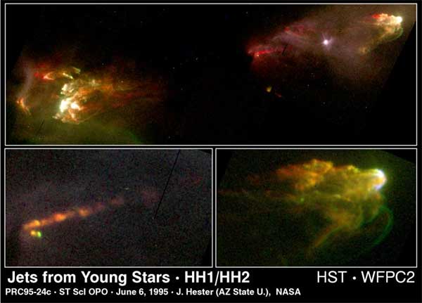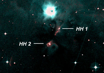 Two of these Herbig-Haro Objects, HH1 und HH2 were examined by Hubble Space Telescope. I was able to observe one of them, HH1, with my 22" Dob. A drawing by Uwe Glahn is here. A wide field image with finder chart and close ups is here.