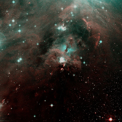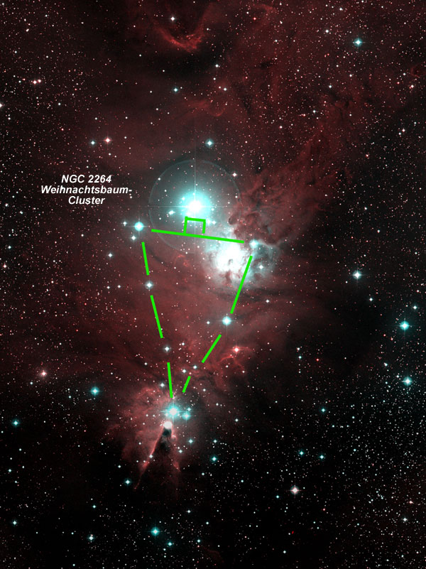 Appropriate for the time of the year, the Christmas Tree Cluster in Monoceros must be included. However, not the tree itself and the reflection nebula around 15 Mon will be the focus here, but rather the Christmas star at the top of the tree. In the picture to the left, the top of the tree is at the bottom, while in the eyepiece it is oriented the way it should be. Somewhat south of the that Christmas star is another starlet, which is already quite dusty and which forms the top of the so-called Cone Nebula. The Cone Nebula is once again a stellar nursery, in which the dust conceals newborn stars. Similarly dark Pillars of Creation can be found in the summer pendant, the Star Queen in M16. The Hubble image of the Star Queen is a true classic, despite its peculiar format due to the WFPC2 camera's sensor arrangement. The Cone is clearly the most difficult among the objects introduced here. You invariably need serious aperture, a dark sky, an H beta filter, and lots of patience. |