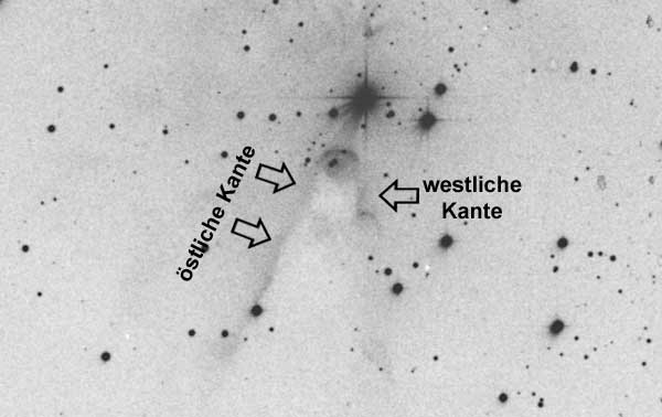 According to the definition of a dark nebular, the cone itself is not visible but only its rims, which stand in front of a somewhat brighter background nebulosity. As this background nebulosity is only weakly excited, an H beta filter is the filter of choice. My first successful observation of the cone was in December 2004 using the 20-Incher of our local astronomy club and an H beta filter. At that time, I could see the eastern rim of the dark wedge. The eastern boundary is somewhat easier to discern, as there are no superimposed stars and the contrast is somewhat higher. During later observations with my 22-Inch Dob, I could see both boundaries as well as further HII nebulosity extending from the eastern rim to the east. |