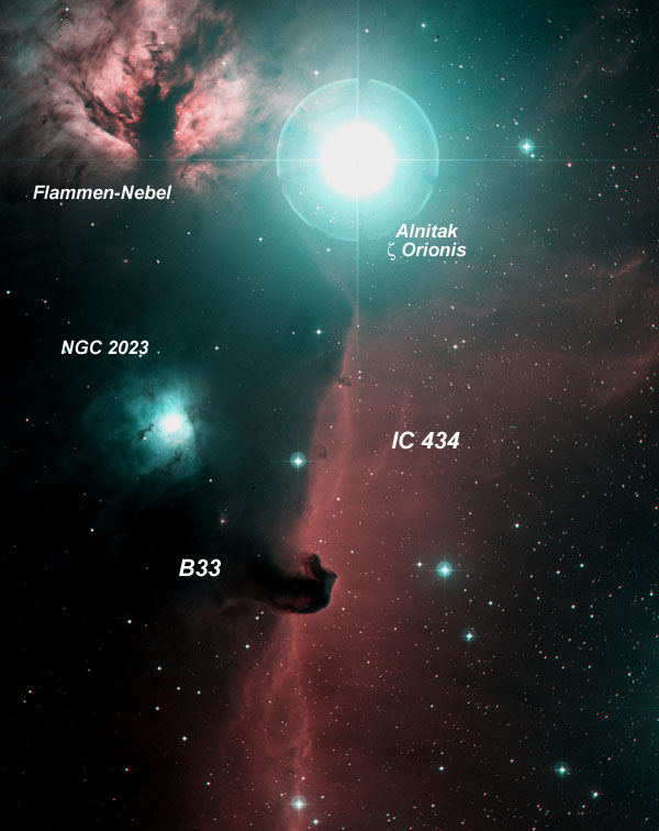 There is need to write much about the Horse Head in Orion, next to Alnitak, the easternmost of the three belt stars. The Horse is formed by a dark cloud, Barnard 33, which superimposes over the HII curtain of IC 434, which extends from Alnitak almost precisely toward south. The difficulty of observing the Horse Head is commonly overrated and depends in the end mostly on the use of the right filter and the experience and previous knowledge of the object of the observer. With my 14-Inch Dob and a H beta filter it is easy and can be seen from my garden at the city border of Freiburg. With a UHC filter, it is accessible as well under a darker sky. As a first