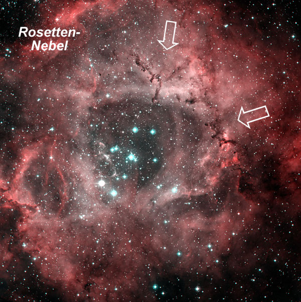 The Rosette Nebula is one of the biggest emission nebula of the winter skies. Despite its size, it is a conspicuous object even in smaller telescopes employing a UHC or OIII narrow band filter. The Rosette Nebula is worth to be observed with more scrutiny. With increasing magnification and some patience (depending, of course also on aperture), it reveals dark filaments that stretch from the void central part around the central star cluster to the denser outer parts. In bigger telescopes that do not have the field to show the entire nebula, these wormholes become the most conspicuous details. In the western part is a filament that is superimposed to the brightest parts of the nebula and that is meandering around its center. Toward south, a group of wormholes forms a conspicuous three-foiled structure that is associated with some people profanely as a Mercedes-Benz Star. |