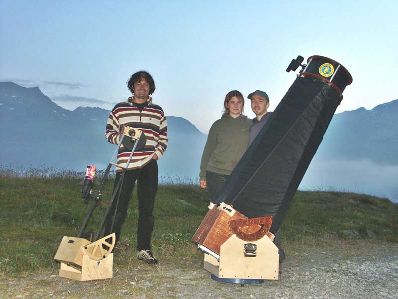 Als Beobachtungsstandort hatten wir uns die Almwiesen von Tätsch ausgesucht, erreichbar über eine ca. 2 km lange unbefestigte Straße von Tiefenbach aus, der letzten kleinen Ansiedlung an der Passstraße von Andermatt zum Furka. Wie ein Aussichtsbalkon auf über 2200 m Höhe bietet diese Alm herrliche Ausblicke: Tagsüber auf die Granitzacken der Urner Alpen und nachts auf einen Sternenhimmel weit abseits jeglicher Lichtverschmutzung. Dort postierten wir uns mit unseren Geräten, Achims 12"-Gitterrohr-Newton auf transportabler Dobsonmontierung, meinem 8"-Reise-Dobson, der sich dagegen fast wie ein Zwerg ausnahm, sowie einem 75-mm-Refraktor.