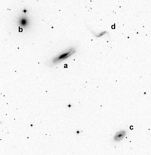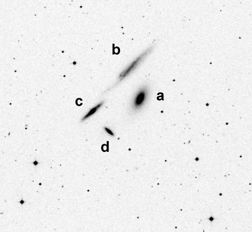 Hickson 61 befindet sich in der nordwestlichen Ecke der Coma Berenices und hat ein ungewöhnliches Erscheinungsbild. Die vier Mitglieder bilden ein fast perfektes Rechteck mit etwa 5 Bogenminuten Kantenlänge. Dieser regelmäßige Eindruck wird durch die edge-on Stellung von b, c und d (NGC 4173, 4175 und 4174) noch unterstrichen. Die Gruppe hat von daher den Eigennamen The Box erhalten. Das hellste Mitglied a, NGC 4169, erscheint im Vergleich zu den anderen drei Komponenten nur leicht elongiert. Die Mitglieder von Hickson 61 haben 12. (a) und 13. Größenklasse (b, c und d) und sind wahrscheinlich schon mit einem 12 Zöller machbar. Ich habe alle vier mit 14 Zoll beobachtet. B ist hierbei die schwierigste Komponente, da sie im Vergleich zu den anderen Mitgliedern eine geringere Oberflächenhelligkeit besitzt. |