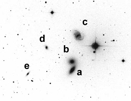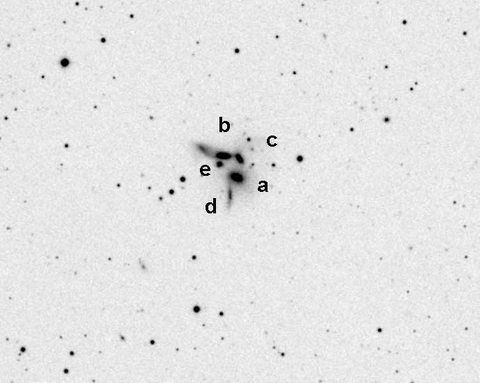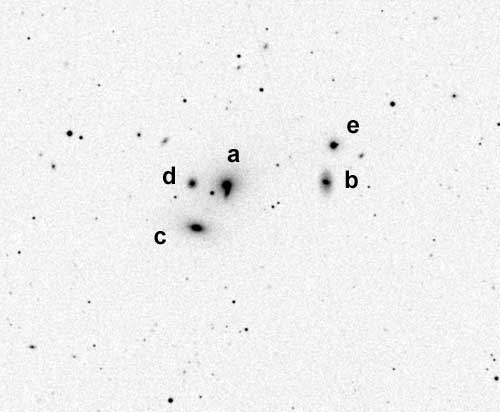 Hickson 68 befindet sich am östlichen Ende der Jagdhunde und ist mit 10 Bogenminuten Ausdehnung schon erheblich enger. Die drei hellsten Mitglieder a, b und c (NGC 5353, 5354 und 5350) haben etwa 11. Größenklasse und sind ebenfalls schon gut im 8 Zöller zu sehen. A und b bilden hierbei ein enges Paar, während die Spiralgalaxie c etwas weiter entfernt steht. Die Komponenten d und e (NGC 5355 und 5358) sind schwächer und kleiner und erfordern etwas mehr Öffnung. Hickson 68 ist für kleinere Teleskope sicher die Schönste der Hickson-Gruppen. |
