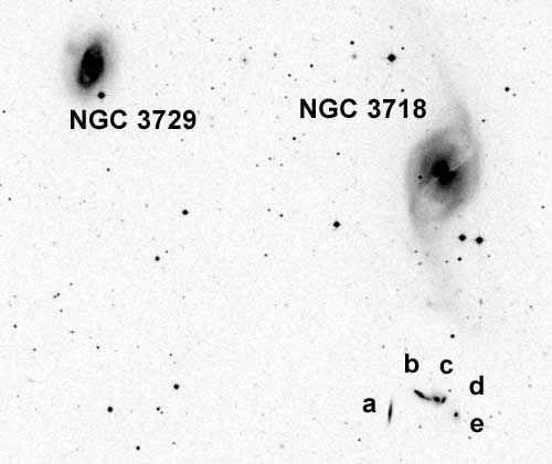 Hickson 56 befindet sich südlich des Kastens des großen Wagens, etwa 7 Bogenminuten südlich von NGC 3718, einer Spiralgalaxie, die für sich schon einen Besuch wert ist. Etwas weiter östlich steht noch NGC 3729. Bei Hickson 56 (enthält keine NGC Galaxien) stellt sich schon richtiges "Hickson-Feeling" ein. Vier Galaxien, b, c, d und e, bilden eine Reihe, die nur etwa 2 Bogenminuten lang ist. A als hellstes Mitglied steht ein wenig abseits. In meinem 14 Zöller konnte ich Hickson 56 als längliches Gewusel indirekt halten, eine Auflösung in Einzelkomponenten gelang aber nicht. Kein Wunder, die einzelnen Mitglieder haben etwa 15. Größenklasse (d ist nochmal schwächer). Mit dem 20 Zöller lassen sich dann einzelne Knoten erkennen und A kann mit viel Geduld vielleicht auch als Einzelgalaxie gesehen werden. Hickson 56 ist sicher nicht leicht, lässt sich durch die Nähe zu NGC 3718 jedoch leicht finden und ist somit vielleicht schon mit 12 Zoll einen Versuch wert. |