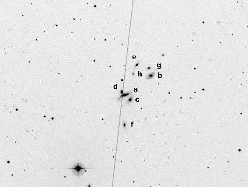 Hickson 57, auch bekannt unter dem Eigennamen Copelands Septett, besteht aus zwei etwa 3 Bogenminuten langen Reihen von jeweils drei Einzelkomponenten, das schwächste Mitglied g steht etwas abseits. Die hellste Einzelgalaxie ist NGC 3753. Mit 14 Zoll war diese Zweiteilung gut zu erkennen, eine weitere Auflösung aber nicht möglich. Im Vergleich zur vorherigen Gruppe sieht man diesmal also zweimal Gewusel anstatt nur einmal. |