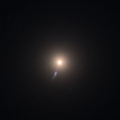 Inspired by observing reports in particular of Stathis Kafalis and of Dave Healy I tackled the challenge of a visual observation in March 2009. That night, the seeing was exceptionally good (at least as compared with the usual nights in the Black Forest) and I observed with my 22" Dob on an equatorial platform. Quite unexpectedly, I was successful already at the first attempt. At lower magnification, M87 was as always a not particularly impressive elliptical blob. M87 as a cD giant galaxy is hardly structured and hence a rather boring object for visual observation, as there is not much to see. After upping the magnification to 400x, the jet could be discerned with surprising ease as a small appendix to the nucleus of the galaxy. Its length was about 20 arc seconds, in agreement with the references in the literature. I had tried to get a feeling for the size of 20 arc seconds by observing Saturn ahead of M87. The jet is visible in the negative image to the left as the distinct dark structure in the core of M87. As expected, I could not discern structures, such as the knots shown above, in the jet. Using the small galaxies in M87's immediate vicinity, the observed position of the jet was found to be in agreement with the photographs. These small galaxies might be helpful to direct your way to the jet under less optimal conditions where the observation is borderline. |