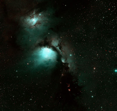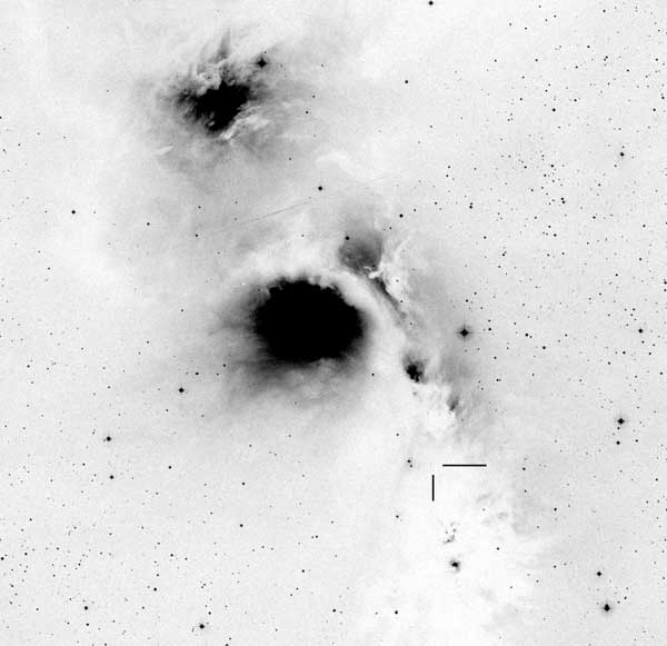 Mit einer Übersichtsaufnahme von M78 und meinem 22" machte ich mich gestern dran. Es ist gar nicht so einfach, die genaue Stelle zu lokalisieren. Bedingt durch die Dunkelwolken ist die Gegend ziemlich sternenleer, und die wenigen verbleibenden Sterne sind ziemlich schwach. Ich musste einige Zeit investieren, bis ich die Feldsterne sicher halten konnte. Direkt neben dem Nebel ist eine schwacher Doppelstern (visuell kaum zu trennen, da zu schwach), der mit zwei anderen Sternen südlich und westlich ein gleichseitiges Dreieck bildet. Direkt westlich des Doppelsterns befindet sich McNeils Nebel. Die Helligkeit des Nebels war etwas geringer als die des Doppelsterns, konnte aber indirekt dauerhaft mit 22" gehalten werden. Als Übersichtsaufnahme hatte ich die links stehende POSS II blue Aufnahme dabei, auf der vom Nebel selbstverständlich nix zu sehen ist, die aber bei der Suche sehr hilfreich ist. Die Position des Nebels ist markiert. |