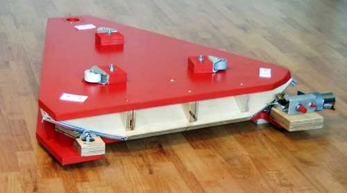 Das Konstruktionsprinzip einer Äquatorialplattform ist recht einfach. Die Plattform besteht aus einer Bodenplatte und einem darauf montierten Tisch, der drehbar gelagert ist. Die Drehachse (Stundenachse) des Tischs wird hierbei parallel zur Erdachse ausgerichtet. Bei 50° nördlicher Breite sollte sie somit in einem Winkel von 50° zur Erdoberfläche stehen und auf den Polarstern zeigen. Damit der Tisch als eine stabile Montage-Plattform dienen kann, muss er an mehreren Punkten gelagert sein. Das südliche Lager (rechts in der ersten Abbildung) ist einfach zu realisieren. Es besteht aus einem Axial-Lager in Richtung der Drehachse. Auf der Nordseite (links in der Abbildung) ist dieses Prinzip nicht anwendbar, da sich hier die Drehachse in einiger Höhe über dem Tisch befindet. Anstelle eines Axial-Lager wird hier ein großer Lagerkreis senkrecht zur Drehachse verwendet, der auf schräggestellten Rollen auf dem Bodenbrett aufsitzt. Wie aus der Abbildung ersichtlich, ist für die Lagerung nicht der komplette Kreis erforderlich. Um eine Nachführung über eine Stunde zu gewährleisten, ist ein relativ kleines Kreissegment, welches schräg an der Unterseite des Tisches montiert wird, ausreichend. Der Tisch wird mit einer Rate von 15° pro Stunde um die Polachse gedreht, so dass eine einstündige Nachführung ohne Kippgefahr für das Teleskop realisiert werden kann. Nach Ablauf dieser Zeit wird die Plattform jeweils wieder von Hand in ihre Ausgangsstellung gebracht. Für den Antrieb einer Plattform gibt es verschiedene Varianten. Ich habe in meiner Plattform einen Reibungsantrieb über eine Gummirolle realisiert. Diese wird über einen batteriebetriebenen Gleichstromgetriebemotor angetrieben, dessen Drehzahl über die anliegende Spannung geregelt wird.
