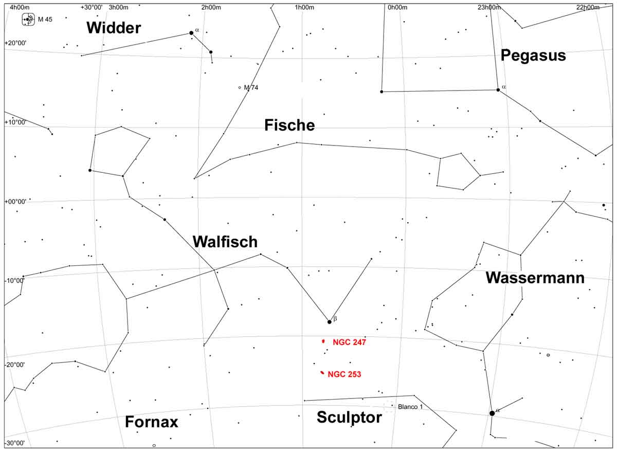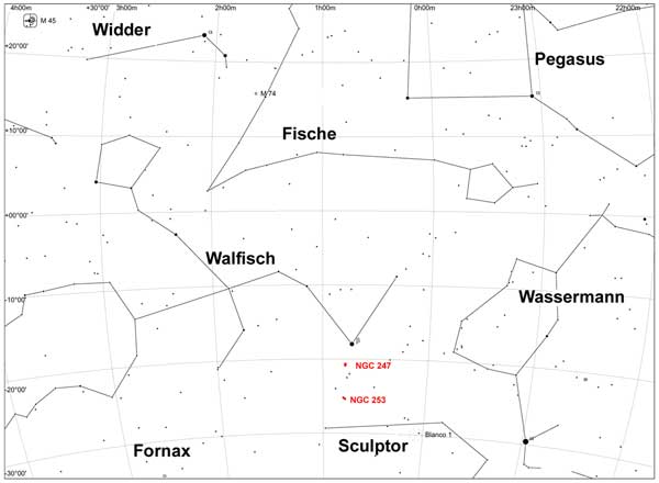 Sculptor is a constellation that does not ring a bell for most of us observers living far North, me included ( I live at 48° N). It is simply to far in the south and creeps over the horizon only in autumn, when Pegasus is high in the sky. Nevertheless, it can be observed. For our excuse, Sculptor as a constellation is not very impressive at all. However, it is home of a number of fascinating galaxies of the Sculptor group, of which NGC 253 and NGC 247 are the most rewarding from our northern latitudes ... rewarding, given that transparency is exceptional down to the horizon, otherwise they are lost in the haze.