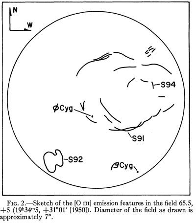 Sharpless 91 filaments The brightest part of the SNR is filament 01, which is directly SE of Phi Cygni and which appears as a very faint narrow segment. Coming from NE, it is passing through mag 8.2 star HD185735 about 15' south of Phi Cygni. The filament extends beyond this star, becoming fainter and more diffuse. After having passed behind 9 Cygni, it can be picked up again as a better defined filament 02, and even the bifurcation towards 2 Cygni to the west can be perceived. Parallel and NW of filament 01 is extremely faint filament 03, which I have not observed yet. Filament 04 is even a bit further NW and appears fainter and narrower than filament 01. The observation can be verified by its precise location relative to a mag 7 and two mag 8 stars aligned to it. In the very west is filament 05, an extension of filament 02, which I have not observed yet.