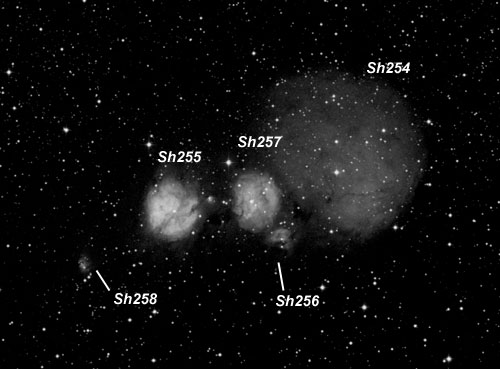 Im 24 mm Okular meines 22-Zoll Dobsons waren die beiden kompakteren Nebel 255 und 257 mit H-beta-Filter sofort als milchige, relativ gut begrenzte Bereiche mit jeweils einem Stern in der Mitte zu sehen. Sharpless 254 war etwas diffuser, aber trotzdem ohne Augenverbiegerei gut zu halten. Die ganze Gruppe passte gut in's Gesichtsfeld des Okulars und den Kontrast zwischen der diffusen 254 und den kompakteren 255 und 257 fand ich besonders schön. Thomas taufte die drei Dinger spontan auf "Die drei Schneebällchen". Mit dem UHC-Filter waren die drei auch noch zu sehen, aber doch um einiges schwieriger als im H-beta. Mit OIII ging aufgrund der nur geringen Anregung der HII-Gebiete erwartungsgemäß nix. Nachdem ich mich von dem Anblick der Gruppe etwas lösen konnte, habe ich noch kurz die kleine Sharpless 258 links versucht. Da aber nicht auf Anhieb was sicheres zu sehen war und sowieso trügerische Sterne überlagert waren, habe ich das ziemlich schnell gelassen. Sh256 war hingegen relativ gut als eigener kleiner Nebelfleck zu sehen, leicht abseits des größeren Sh257 Schneebällchens. |