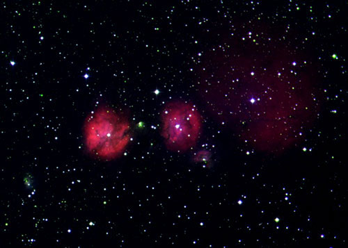 Für mich das Highlight der Nacht war eine Gruppe von Sharpless-Nebeln im Orion. Die Gruppe umfasst von links nach rechts Sharpless 255 und Sharpless 257 als kompaktere HII-Gebiete und Sharpless 254 als etwas diffuseres Objekt ganz rechts (Sh257 entspricht IC 2162). Außerdem sind noch die ganz kleinen Objekte Sharpless 258 und 256 etwas nach unten versetzt. Die ganze Gruppe befindet sich zwischen Orion und den Zwillingen. Eine Aufsuchkarte dazu habe ich hier. |