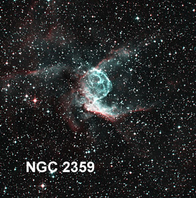 NGC 2359 ist ein Emissionsnebel im Großen Hund, der auch unter den Namen Duck Nebula oder Thors Helm bekannt ist. Der Nebel befindet sich recht weit südlich, in der Nähe der beiden Offenen Sternhaufen M46 und M47. NGC 2359 ist einer der Nebel, die wie der Cirrus-Nebel im Schwan besonders stark von Nebelfiltern profitieren. Während ohne Filter zunächst nur ein länglicher Nebelfleck vor einer Gruppe von Sternen auffällt, zeigt sich mit UHC- oder OIII-Filter erst die ganze Größe des Nebels, und es lässt sich unter guten Bedingungen eine nach Norden ziehende schwache Blase erkennen. NGC 2359 besteht, wie zum Beispiel auch der Crescent-Nebel im Schwan, aus der teilweise abgestoßenen Atmosphäre eines sogenannten Wolf-Rayet-Sterns. |