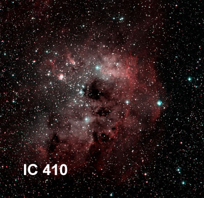 IC 410 ist eine HII-Region bei einer auffälligen Sternengruppe im südlichen Teil des Fuhrmanns. IC 410 ist eingebettet in einen großflächigen Sternhaufen (NGC 1893). Der Nebel besitzt eine Hufeisenform mit einem auffällig dunklerem Innenbereich und einem Ausläufer nach Südosten. IC 410 ist ein recht großer Nebel. Von daher sollte man mit kleinen Vergrößerungen beginnen. Der Einsatz eines UHC- oder OIII-Filters ist auch hier hilfreich, da durch die Filter der Kontrast zur Umgebungshelligkeit vergrößert wird. Mit UHC-Filter konnte ich IC 410 schon im Viereinhalbzöller vom Freiburger Stadtrand aus sehen, für Details braucht es dann aber doch einen dunkleren Himmel und auch mehr Öffnung. Direkt in der Nachbarschaft gibt es noch eine Reihe weiterer interessanter Objekte, wie den bekannten Offenen Sternhaufen M36, M37 und M38, dem sehr viel schwierigeren Flaming Star Nebel IC 405, dem schwachen, in den Sternhaufen Stock 8 eingebetteten Nebel IC 417, oder dem kleinen, aber sehr hellen Nebel NGC 1931. |