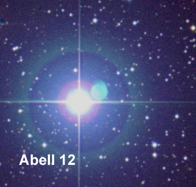 Abell 12 (PK 198-06.1) im Orion ist ein ganz besonderer Nebel. Er ist, für sich gesehen, ein kleiner, heller, aber nicht sonderlich interessanter Planetarischer Nebel. Die Besonderheit liegt darin, dass er extrem nahe bei µ Ori, einem Stern vierter Größe etwa drei Grad nordöstlich von Beteigeuze, steht. So sehr µ Ori das Auffinden des Nebels erleichtert, so sehr erschwert er dessen Beobachtung. Ein OIII- oder auch ein UHC-Filter ist sehr hilfreich, da er das Licht des Sterns zu einem großen Teil abblockt. Ansonsten empfiehlt es sich, hier richtig hoch zu vergrößern (>200x), um das kleine, nur etwa 35" große Scheibchen des Nebels etwa eine Bogenminute (!) südöstlich des Sterns in dessen Strahlenkranz ausmachen zu können. Die Schwierigkeit bei Abell 12 liegt darin, den Nebel das erste Mal zu sehen. Hat man ihn dann einmal geknackt und weiß, wie er aussieht, kann man gar nicht mehr nachvollziehen, warum man den nicht gleich gesehen hat. Die Abbildung gibt einen guten Eindruck vom Erscheinungsbild im Okular. Der Nebel hat etwa 12. Größenklasse, obwohl er in mehreren Katalogen mit mag 13.9 angegeben ist. |