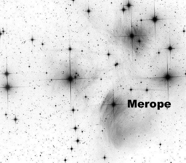 Der letzte der vier Nebel (und sicher auch der bekannteste unter ihnen) ist der Merope-Nebel (NGC 1435) in den Plejaden, der somit ebenfalls leicht zu finden ist. Er ist mein "Himmelsprüfer", an dem ich die Transparenz einer Winternacht abschätzen kann. Die Sichtbarkeit des Merope-Nebels hängt sehr stark von der Dunkelheit des Himmels ab. In Stadtnähe ist es aussichtslos, diesen Nebel zu sehen, während er auf dem Schauinsland eigentlich immer gut zu sehen ist. Beim Merope-Nebel muss man ein bisschen mit der Vergrößerung spielen, um einen optimalen Kontrast zwischen Nebelhelligkeit und der vom Beobachtungsort abhängigen Himmelshelligkeit zu erreichen. Der Merope-Nebel ist kein Emissionsnebel, sondern ein Reflektionsnebel, der vor allem den blauen Anteil des Lichts des Sterns Merope in den Plejaden reflektiert. Von daher verbessert auch hier ein UHC- oder ein Deep-Sky-Filter die Sichtbarkeit merklich, obwohl der Nebel kein Linienstrahler ist. Der Merope-Nebel zeigt sich als fächerförmige Aufhellung, die von Merope weg etwa ein halbes Grad weit nach Süden zieht. Am auffälligsten ist der Nebel in einiger Entfernung zu Merope, wo er sich nicht mehr so sehr im Licht des Sterns verliert. Während der Nebel unter wirklich dunklem Himmel sehr deutlich hervortritt, ist er unter weniger optimalen Bedingungen oftmals schwierig vom Streulicht des Sterns, von Dunst in der Atmosphäre oder vom Streulicht leicht beschlagener oder verschmutzter Okulare zu unterscheiden. Auch hier gilt dasselbe wie bei Abell 12: Am schwierigsten ist die Identifizierung des Nebelfächers bei der ersten Beobachtung. Hat man ihn schon einmal beobachtet und weiß, wie er im Okular erscheint, so wird man ihn auch unter weniger optimalen Bedingungen sicher sehen können. Bei Zweifeln kann ein Vergleich mit den anderen Plejadensternen hilfreich sein, die zum Teil zwar auch von Nebeln umgeben sind (siehe Bild), deren sichere Beobachtung aber noch mal eine ganze Ecke schwieriger ist. |