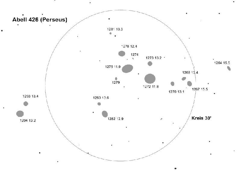 Der erste ist Abell 426 im Perseus, aufgrund seiner Ausnahmestellung auch oft kurz Perseus-Cluster genannt. Er befindet sich etwa 2 Grad östlich von Algol. Abell 426 ist ein unglaublich reicher Galaxienhaufen. Mit meinem 14-Zoll Dobson habe ich irgendwann aufgehört die Einzelgalaxien zu zählen. Steve Gottlieb hat mit seinem 17.5-Zoll Dobson nicht weniger als 58 Einzelmitglieder beobachtet und im Detail beschrieben (siehe WWW-Link unten). Der Perseus-Cluster besitzt zwei überdurchschnittlich helle Einzelgalaxien, NGC 1272 und NGC 1275. Letztere ist eine S0 Galaxie und identisch mit der starken Radioquelle Perseus A und der Röntgenquelle 3C84. Im direkten Umfeld dieser beiden Galaxien finden sich über 10 weitere Galaxien, die heller sind als mag 15.0.