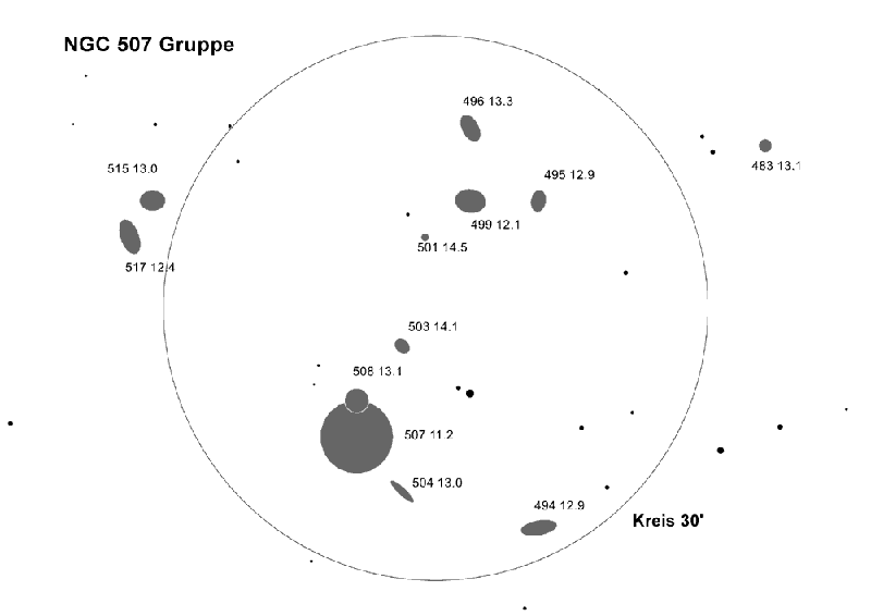 Ein zweiter interessanter Haufen ist die Gruppe um NGC 507. Dieser Haufen liegt in den Fischen, ziemlich genau zwischen M33 und Mirach, b Andromedae. NGC 507 ist eine elliptische Riesengalaxie mit einer Helligkeit von mag 11.2. Um sie herum liegen sieben weitere Galaxien heller als mag 13.0, und noch viele weitere, die schwächer sind. Die 507er-Gruppe ist somit für kleinere Öffnungen fast noch lohnender als der Perseus-Cluster. Mit meinem 14" Dobson waren dann schon 15 der Haufenmitglieder problemlos zu sehen.