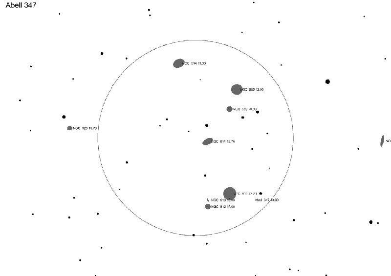 Ein weiterer Abell-Cluster, Abell 347 liegt in der Nähe von NGC 891, einer riesigen edge-on Galaxie im Sternbild Andromeda mit vergleichsweise geringer Oberflächenhelligkeit. Abell 347 besitzt mehrere Galaxien mit Helligkeit um mag 14. Die hellste Einzelgalaxie ist NGC 910 mit mag 12.2.