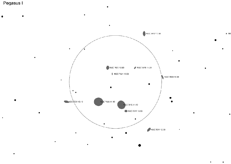 Der letzte Haufen, den ich vorstellen möchte, ist der Pegasus I Cluster an der Grenze zwischen Pegasus und den Fischen. Diese Gruppe ist etwas lockerer und enthält als hellste Galaxien NGC 7619 und 7626 mit jeweils mag 11.1.