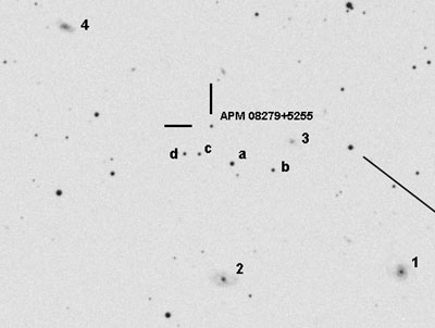 APM 08279+5255 12 billion years old light from a lensed quasar in Lynx 08 31 42 +52 45 17 APM 08279+5255 is a quasar with a red shift of z = 3.91, corresponding to a light travel time of about 12 billion years, and is placed therefore "at the edge of the universe". The quasar is the active nucleus of a giant elliptic galaxy, driven by a black hole of estimated 23 billion solar masses. The brightness of the quasar is given by mag 15.2 (red) and 16.2 (vis, Nomad), the visual estimates according to observing reports by Achim Strnad and Stathis Kafalis are mag 15.6 and slightly brighter than 17.0, respectively. With my 22", the quasar was visible about 30% of the time by averted vision at the right location, not too far from single-photon detection :-). Actually, this should be a boring object, not much to see except for a tiny spec of light. It becomes fascinating only by knowing that these few photons have traveled 12 billion years. When the actually started their journey, the universe had only 12% of its current age. Cool, isn't it?