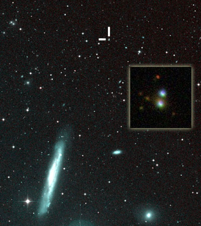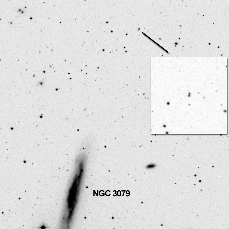 The double quasar QSO 0957+561A/B can be found about 10 arcminutes NNW of the bright galaxy NGC 3079 and can be reached starting there by a relatively easy star hop. The quasar has a red shift of z=1.39, corresponding to a distance of 3.7 billion LYs. The two "objects" are two images of one and the same quasar separated by 6 arcseconds by gravitational lensing. Both images are about mag 17. Interestingly, the light of the two images has travel times that differ by 417 days, as revealed by the intrinsic variability of the quasi-stellar object. The quasar itself is not particularly difficult with 22" aperture. The problem is separating the two images. 6 arcseconds sounds like a lot, but it isn't when the two objects are very faint and indirect vision is required for seeing them. During several observations, I could see the quasar always with certainty using averted vision, but I could never split the images cleanly. For a clean split, the conditions likely have to be perfect at that aperture. |