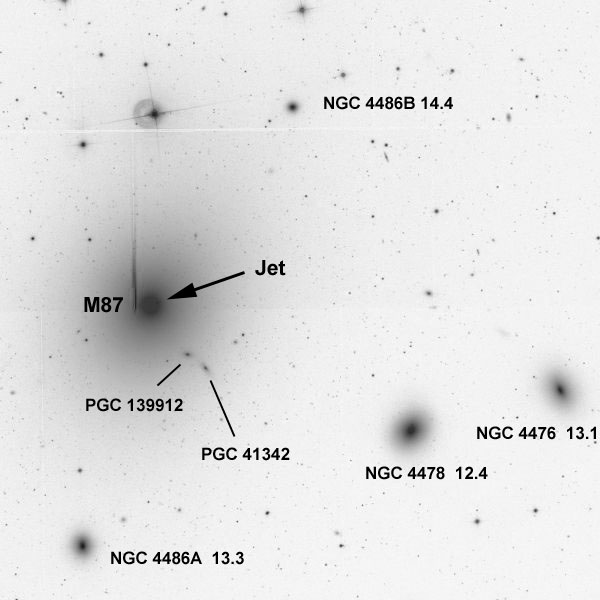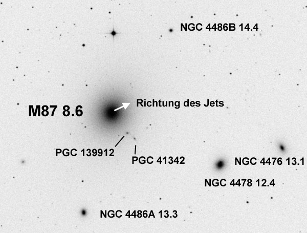 M87 is the central galaxy of the Virgo Cluster. It has a brightness of mag 8.6 and belongs to the elliptic cD giant galaxies, that swallow up over time their entire neighborhood. M87 is identical with the very strong radio source Virgo A. In the middle of M87, scientists expect a super massive Black Hole of about 6 billion solar masses, that is surrounded by an accretion disk of incident matter. Out of this center of the galaxy emanates a jet of mater at relativistic speed, that emits broad-band polarized synchrotron radiation. This jet is presumably collimated by strong magnetic fields of the accretion disc and the rotating Black Hole itself. In March 2009 in a night of excellent seeing, I was successful already at my first attempt. With low powers there was first the familiar image of M87, that is visually not particularly interesting and does not knock your socks off. M87 belongs to the more boring galaxies, as there are, typical for an elliptic cD galaxy, hardly any structures visible. Increasing the power to 400x, the jet was relatively easy to discern as a short and thin appendix to the core of the galaxy. The length was only 20", in agreement with the literature. During a prior observation of Saturn at the same power, I had tried to memorize this dimension in order to get an estimate of what to expect. As to be expected, structures within the jet were not visible with my Dob. Using the small background galaxies (the small PGC galaxies, not the much brighter and larger NGC galaxies!), I could further verify the correct orientation of the observed structure. These faint galaxies can be helpful under less than optimal conditions and borderline observations. I presume that a successful observation of the jet depends largely on the seeing. The jet is very small and merges into the glow of M87 under sub-optimal seeing. On the other hand, you will not need particularly dark skies, as the core of M87 in the "background" is bright anyways. This was confirmed during later attempts at this object. During at least 6 occasions, I was successful only twice, always at very good seeing. Altogether, this is a very interesting story, astrophysics live at the eyepiece. Is there any other way to get closer to a Black Hole?