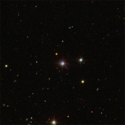 3C 273 is an entry of the Third Cambridge Catalog (3C) of radio sources. Its optical counterpart was the first quasar of which Maarten Schmidt discovered the spectrum to consist of almost 16% red shifted HII emission lines. Quasars are galaxies with extremely bright nuclei, where matter spins on an accretion disk into a central Black Hole. The red shift of 3C 273 of z=0.158 corresponds to a distance of 2.4 billion LYs. At the telescope, 3C 273 appears as a stellar object of brightness mag 12.8. The absolute brightness of the quasar, however, is roughly 300-fold larger than that of our entire Milky Way. The jet, pointing to SW and visible in the SDSS image, is not within visual reach. |