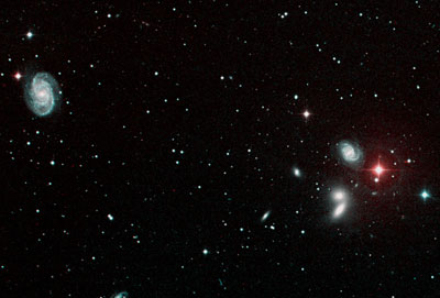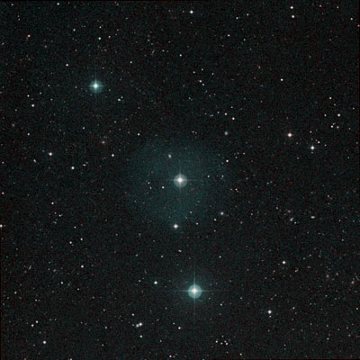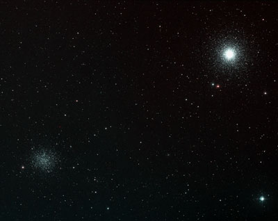These are two extremely different globular clusters that are in the same low power field somewhat to the W of Arktur. Both globulars are at a distance of roughly 60 000 LYs. They are therefore not a chance alignment along our line of sight, but really neighbors in space. Their very different appearance is therefore entirely due to their differing size and structure and not due to differing distance. M 53 is a relatively well concentrated globular (class V in a classification ranging from I (very concentrated) to XII (loose) ), while NGC 5053 is considered class XI. NGC 5053, on the other hand, is considerably more difficult than implied on the POSS image to the left, and does not look at all like a globular! It has a brightness of mag 9.8 and consists of roughly 3 500 stars, of which the brightest reach mag 13.8. "Normal" globular clusters have several 100 000 stars! NGC 5053 is easily overlooked also with a large telescope, as it does not appear as a globular but rather like a very faint, grainy glow, with the brightest stars being already resolved. More about this very odd couple is here.