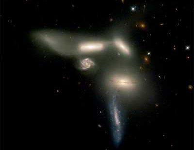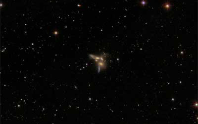 Hickson 79 alias "Seyfert's Sextet" is the absolute showpiece of the extremely tight Hickson groups. Five galaxies and a tidal plume squeezed into a horseshoe of only 2 arcminutes.