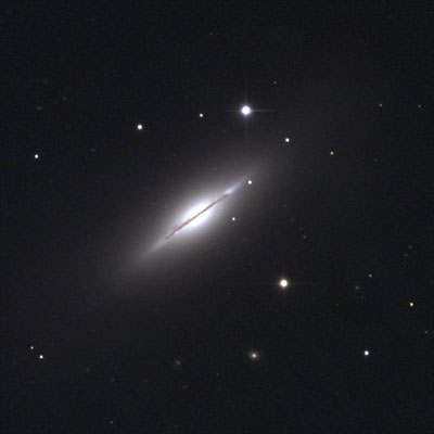 The assignment of M102 to NGC 5866 in Draco is reported to be not unequivocal, as Charles Messier did not indicate a precise location of this entry in his list. This probably does not matter a lot to this galaxy, which is a beautiful sight in the eyepiece, be it with or without Messier number. This galaxy is a prototype of a bright lenticular galaxy of type S0. The most interesting feature is the very fine dust lane crossing its body, requiring good seeing for resolution. If you happen to have such good conditions, the dust band is visible first as cutting through the core of the galaxy, its central bulge. There is the an interesting visual effect, if you follow the dust lane to the ends of the edge-on galaxy, as these fainter extensions of the galaxy appear to "compete" with the dust lane, resulting in a kind of blinking effect. |
