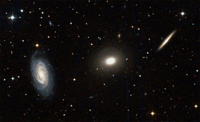 This is a wonderful galaxy trio at a distance of 100 to 130 million LYs, that is very interesting already with medium sized telescopes. The three galaxies of this trio couldn't be more different: NGC 5985 is the easternmost of the three and almost a face-on SBb spiral with brightness mag 11.1 and a diameter of 5'. NGC 5982 is in the middle and is an elliptic galaxy with brightness 11.3. The westernmost galaxy, NGC 5981, is an Sbc spiral seen edge-on. At a brightness of 13.6, this is by far the faintest of the three and in smaller telescopes the most difficult.