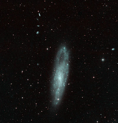 NGC 247 (00h 47, -20° 46') has a length of 21' and is therefore only slightly smaller than NGC 253. NGC 247 lacks all those features where NGC 253 excels. Not only is it at mag 8.9 more than one and a half magnitude fainter. It also lacks pronounced internal structure. Even with my 22" Dob, NGC 247 appears as a ghostly elongated streak with no details except for a condensation towards the middle. A mag 9 star at its southern end gives the impression of the galaxy being hooked to it. At my 48° northern latitude, the galaxy disappears easily under hazy conditions due to its location close to the horizon (despite being even 4.5° farther north than NGC 253). The chain of background galaxies visible in the image NE of the galaxy is known as Burbidge's Chain and a challenge for larger telescopes.