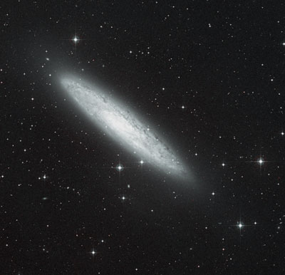 NGC 253 (00h 47, -25° 17') bears as the "Sculptor Galaxy" even the name of the galaxy cluster and the name of its constellation, being the central galaxy of the Sculptor Group. With a brightness of mag 7, it extends over half a degree and is despite its position only slightly above the horizon (at my 48° N latitude) a conspicuous object. Under optimal transparency and with a large Dob, however, it becomes a fascinating object and easily steals the show from even M31. In contrast to the Andromeda Galaxy, NGC 253 is highly structured with several dust lanes and knots and appears as an almost three-dimensional whirlpool. At the eyepiece, its appearance is comparable then to the DSS image to the left. Classified as an SABc galaxy, it is a widely opened spiral with a small central bar, which is, however, hard to see due to foreshortening.