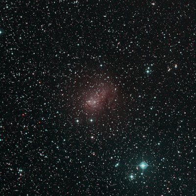IC 10 is only one degree further towards E and belongs as one of the brighter dwarf galaxies of our Local Group to the Andromeda Galaxy. IC 10 is a relatively young star burst galaxy with very active star formation. IC 10 is an observing target intermediate between the two brightest companions of the Andromeda Galaxy, NGC 185 and 147, and the fainter dwarf galaxies IC 1613 or WLM. At the eyepiece, it appears under fair conditions as a faint, but distinct elongated patch, well above the sky background. The lower image reveals a number of HII regions in this galaxy of which some are within reach for visual observation. The southern part of the galaxy appears much better defined as compared with its northern end, which is comprehensible from the image. Even without any filters, this part of the galaxy appears structured, which is due to one of the brighter star forming regions. With UHC or OIII filter, these regions can be identified more clearly. The effect of the filter is, however, not that pronounced, as the light of the young intense stars in these HII regions gets blocked. Interestingly, under light polluted skies, the brightest of the these HII regions may be even more distinct than the galaxy itself. During an observing session with a limiting magnitude of only 5.5, the star forming region was distinct, while the galaxy itself remained very vague only.