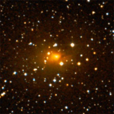 Maffei 1 is a huge elliptic galaxy just beyond our Local Group and belonging to the IC 342/Maffei Group. Maffei 1 were one of the brightest galaxies in our sky, if, yes, if it were not positioned from our view point behind the plane of our Milky Way. The dust in our galactic plane attenuates the light from Maffei 1 to only 1/120, corresponding to a dimming by 5 magnitudes. At the telescope, Maffei 1 appears as a faint oval brightening without further structure. Superimposed onto the galaxy is the unimpressive and loose open cluster Czernik 11. About 1 degree east is Maffei 2, a similarly dimmed spiral galaxy, which is, however, considerably more difficult than Maffei 1.