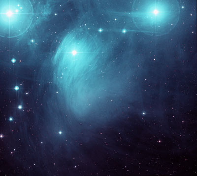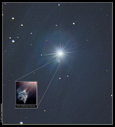 Merope Nebula (NGC 1435) is the brightest one of the reflection nebula in the Pleiades. Under good conditions, it is visible even in large binoculars as a faint fan-shaped smudge, extending from Merope outward of the cluster. Merope Nebula is one of those objects that can be hard to observe for the first time and that become relatively easy once you know what to look for. These reflection nebula are actually not remainders of the molecular cloud in which the open cluster initially formed. Rather, they originate from denser parts of interstellar matter, through which the cluster presently happens to pass through. The visibility of the Merope Nebula is a good criterion to judge the quality of your sky. Superimposed on the large Merope Nebula is a much smaller one, Barnard's Nebula (IC 349), which is brighter, but very close to Merope, extending only 30" from it. IC 349 is considerably more difficult than the Merope Nebula and not just visible at first sight. Instead, it requires a lot of patience to successfully observe it. When I observed it for the first time, I used a 6mm eyepiece equipped with a strip of black slide film at the field stop. This allows placing Merope behind that strip and to suppress its glare (this is actually the same equipment that I use for Sirius B). With a lot of patience, a small appendix to Merope could be made out. Its orientation could be noted using the surrounding small field stars and later be verified using photographs of this object. Barnard's Nebula has a diameter of only 30" and is nicely resolved in the image by Geert Vandenbulcke (left). The HST inset further reveals the bizarre structure of IC 349, caused by dust filaments eroded by the radiation pressure of Merope.
