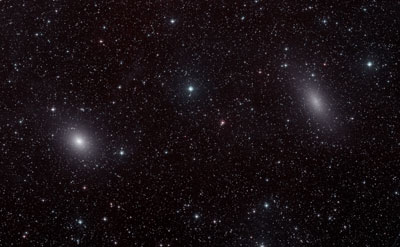 These two galaxies are companions to the Andromeda Galaxy and have, typical for most dwarf galaxies, an only low surface brightness. It is, however, still much higher than all other companions of M31 or our own galaxy, with the exception of the Magellanic Clouds. NGC 185 is somewhat easier to observe than NGC 147 and appears more condensed, despite having approximately similar size. A challenging target is a dark lane NW of the center of NGC 185.