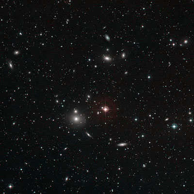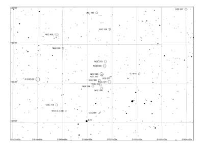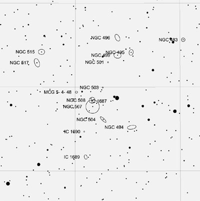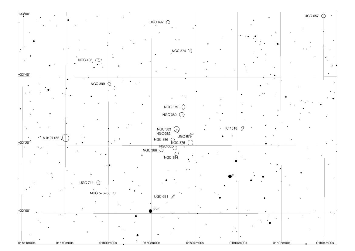 This group is just around the corner of the NGC 383 group. NGC 507 is a giant elliptical galaxy with a brightness of mag 11.2. It is surrrounded by seven more galaxies brighter than mag 13.0 and much more that are fainter. The NGC 507 group is therefore similarly as the NGC 383 group a rewarding target also for smaller scopes. Wtih my 14" Dob, 15 galaxies were visible without problem. Compared to the 383 group, the 507 group appears a bit more difficult, despite that the member galaxies have similar magnitudes. This is probably due to the larger number of bright foreground stars in the immediate vicinity, making it a bit more difficult to identify the galaxies. This galaxy group is at a distance of about 200 million LYs and belongs as well to the Pisces-Perseus super cluster.