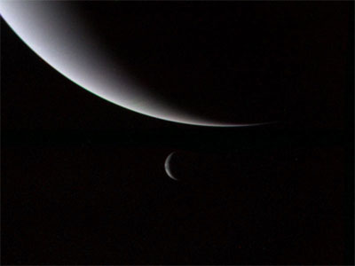 Neptune has a maximal brightness of 7m8 and a maximal diameter of its disk of 2.5". The only satellite within reach of amateur telescopes is Triton. All other moons are mag 19 or fainter. Triton at 13m4 (2700 km) Triton revolves Neptune in a little less than 6 days with an orbit inclined by 157° compared to the ecliptic. At present, we have a polar view of this planetary system, such that Triton is always at sufficient distance from the planet. Due to its brightness, it is even easier to observe than any of the moons of Uranus. Despite being more distant than the moons of Uranus, Triton is brighter. This is due to two reasons: Its diameter is almost twice as large as that of the larger Uranus satellites; and Triton has a comparatively large albedo of 0.76 hinting at a bright ice surface, while the typical albedo of the Uranus satellites is only half of that. For comparison: Titan, the largest moon in Saturn's system has a diameter of 5150 km and a brightness of up to 8m4, while Ganymede, the brightest and largest satellite in Jupiter's system, measures even 5262 km with a peak brightness of 4m6. Our familiar Moon, on the other side, measures only 3476 km.