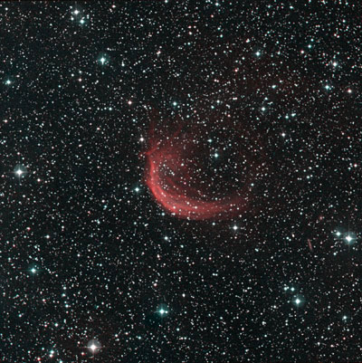 Simeis 22 belongs to the apparently largest planetary nebula and is one of the brighter ones of the illustrious list of the large PN. Its diameter is 10' and, with OIII filter, it appears as a large crescent-shaped brightening, so to say a dimmer version of the Medusa Nebula, Abell 21. In contrast to Abell 21, the crescent does not appear closed visually. Under very good conditions, single filaments are at the edge of detection, giving the PN a somewhat striated appearance.
